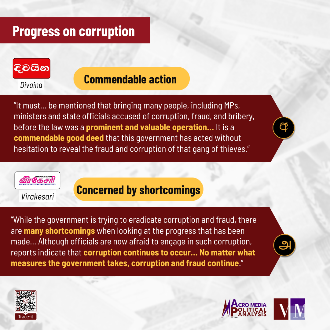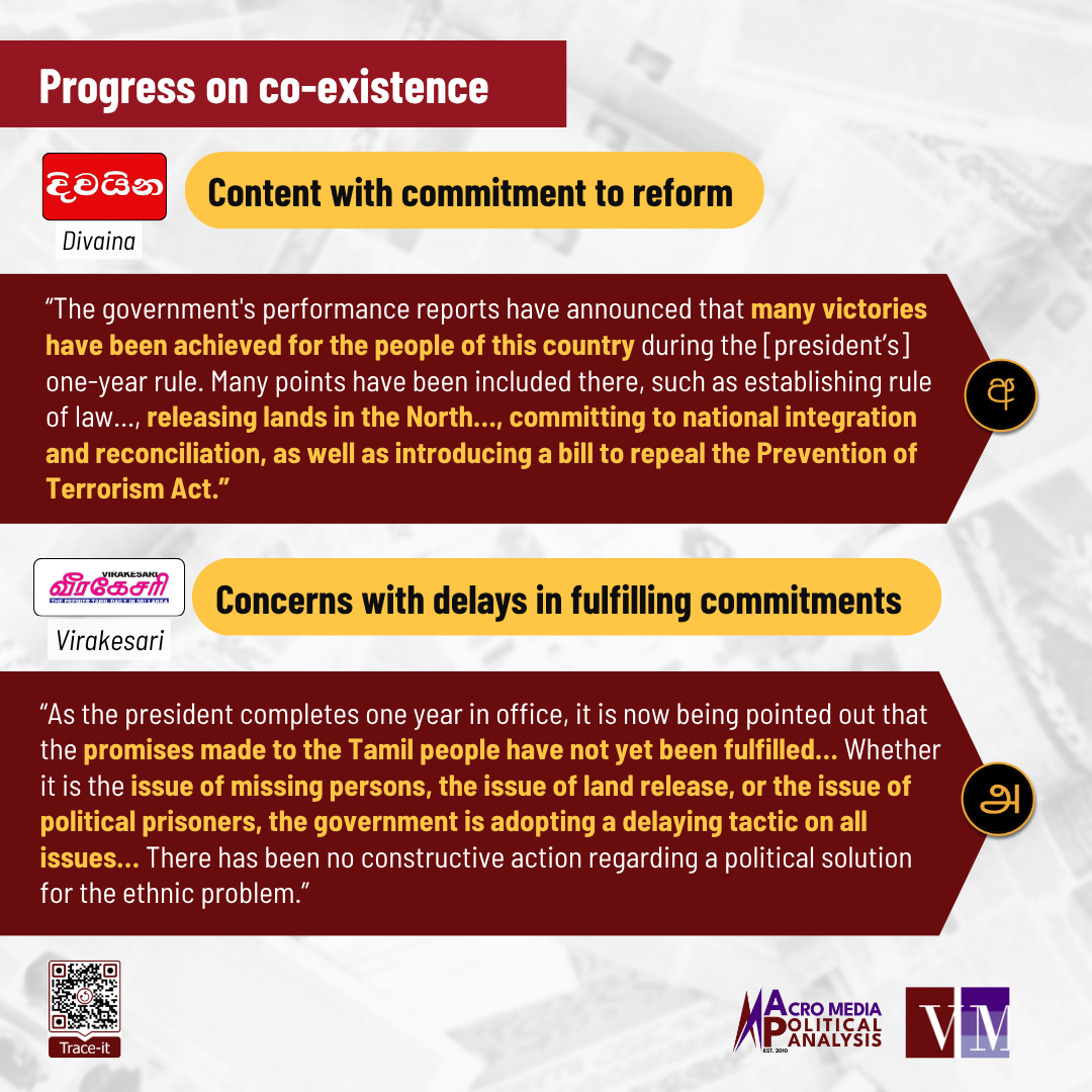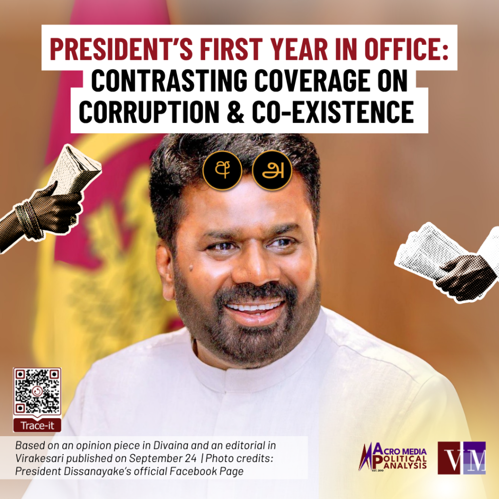 September 21, 2025, marked one year since Anura Kumara Dissanayake was elected president. Commenting on the government’s progress during their first year, privately-owned Sinhala newspaper Divaina and Tamil newspaper Virakesari featured contrasting views on the government’s progress on corruption and co-existence.