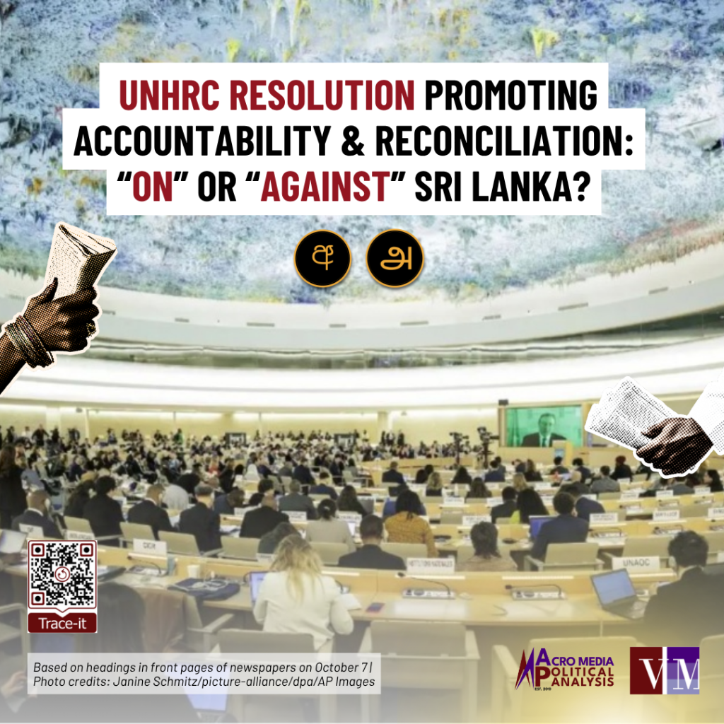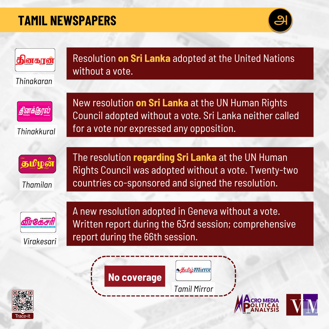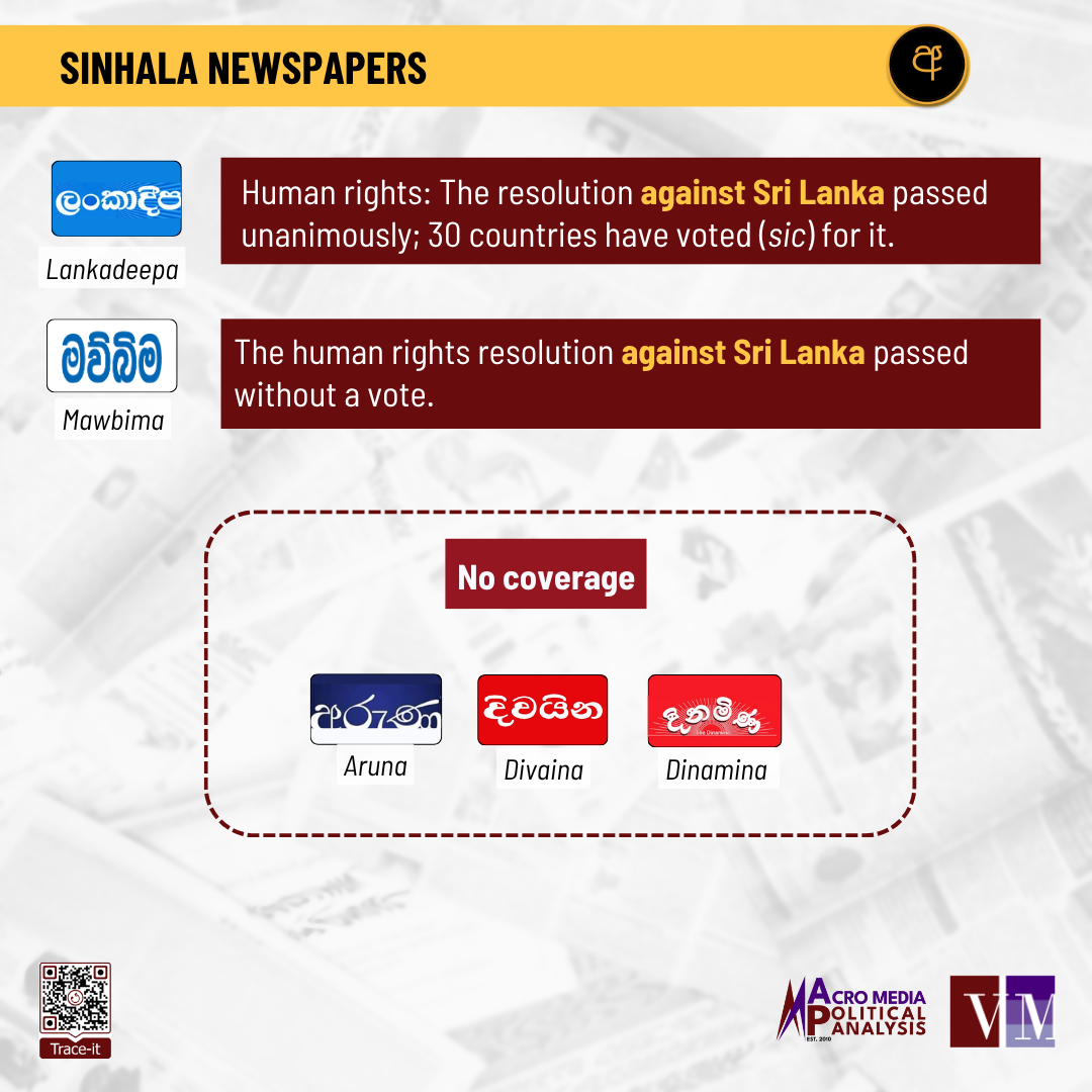 The UNHRC recently adopted a resolution titled “Promoting reconciliation, accountability and human rights in Sri Lanka” without a vote. The front page headings of Tamil newspapers Thinakaran and Thinakkural referred to it as a resolution “on Sri Lanka”, while the front page headings of Sinhala newspapers Lankadeepa and Mawbima referred to it as a resolution “against Sri Lanka”.