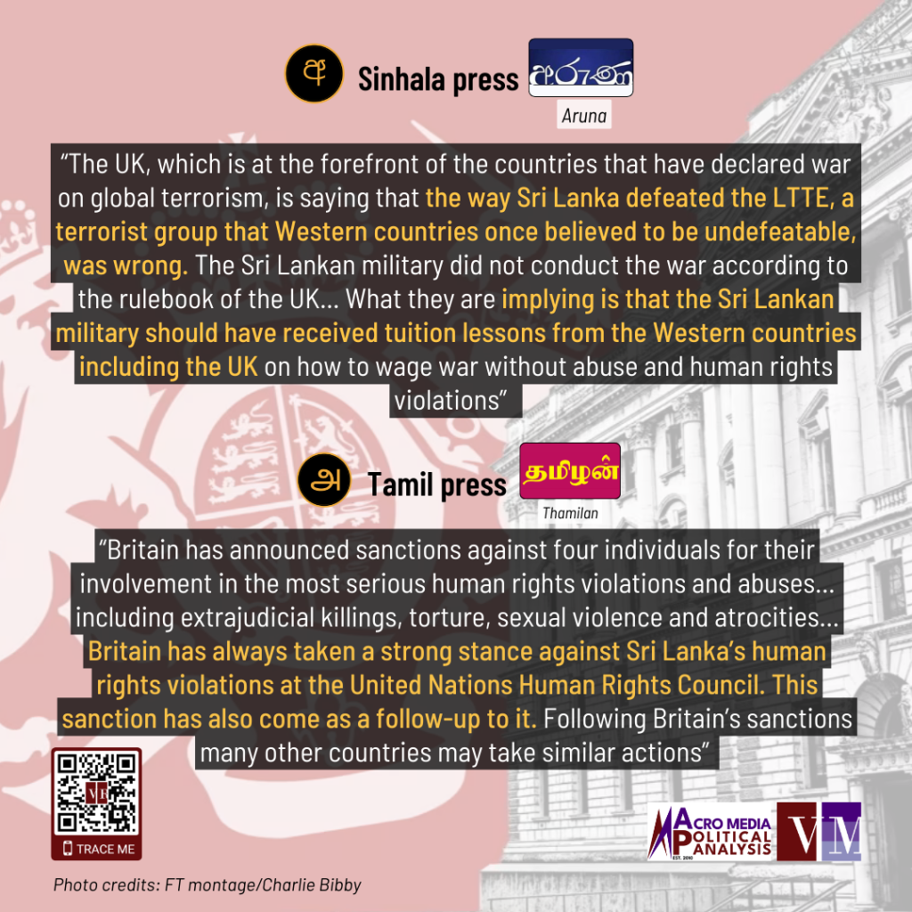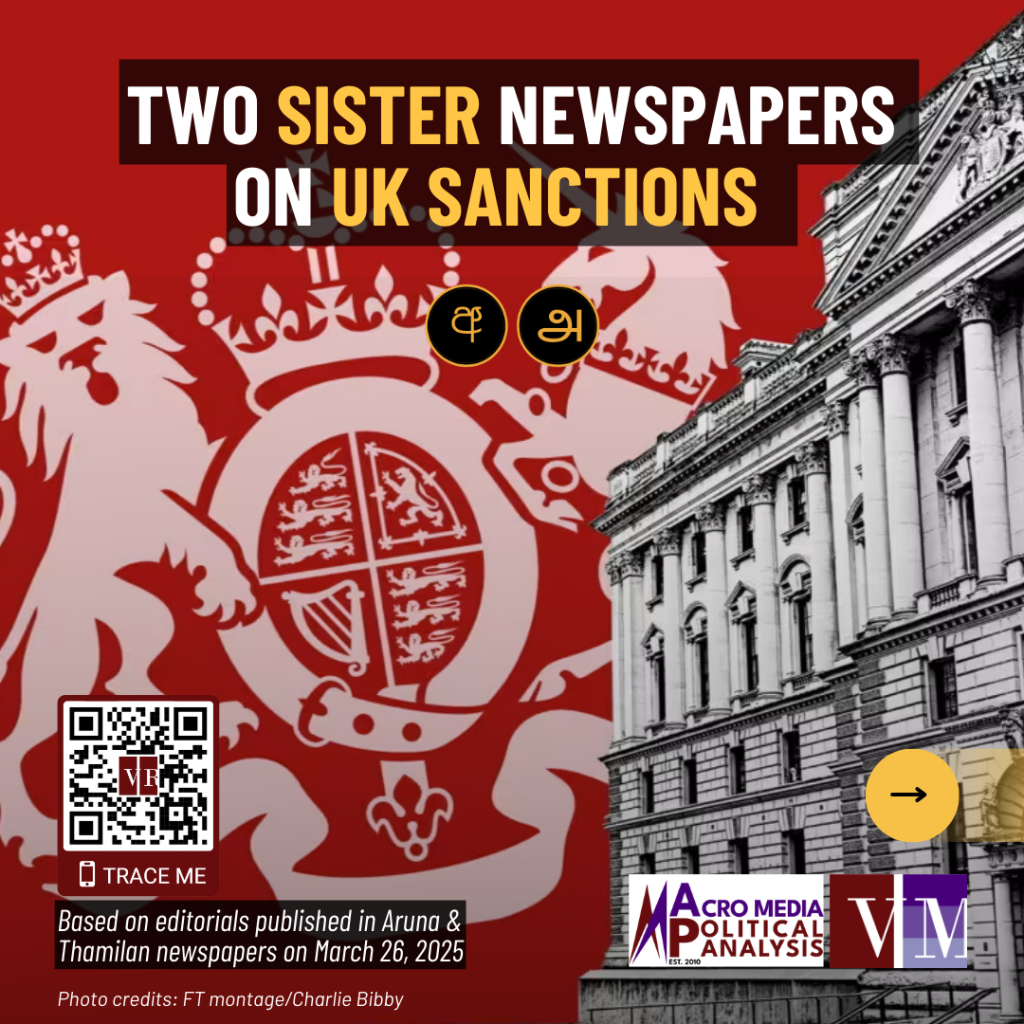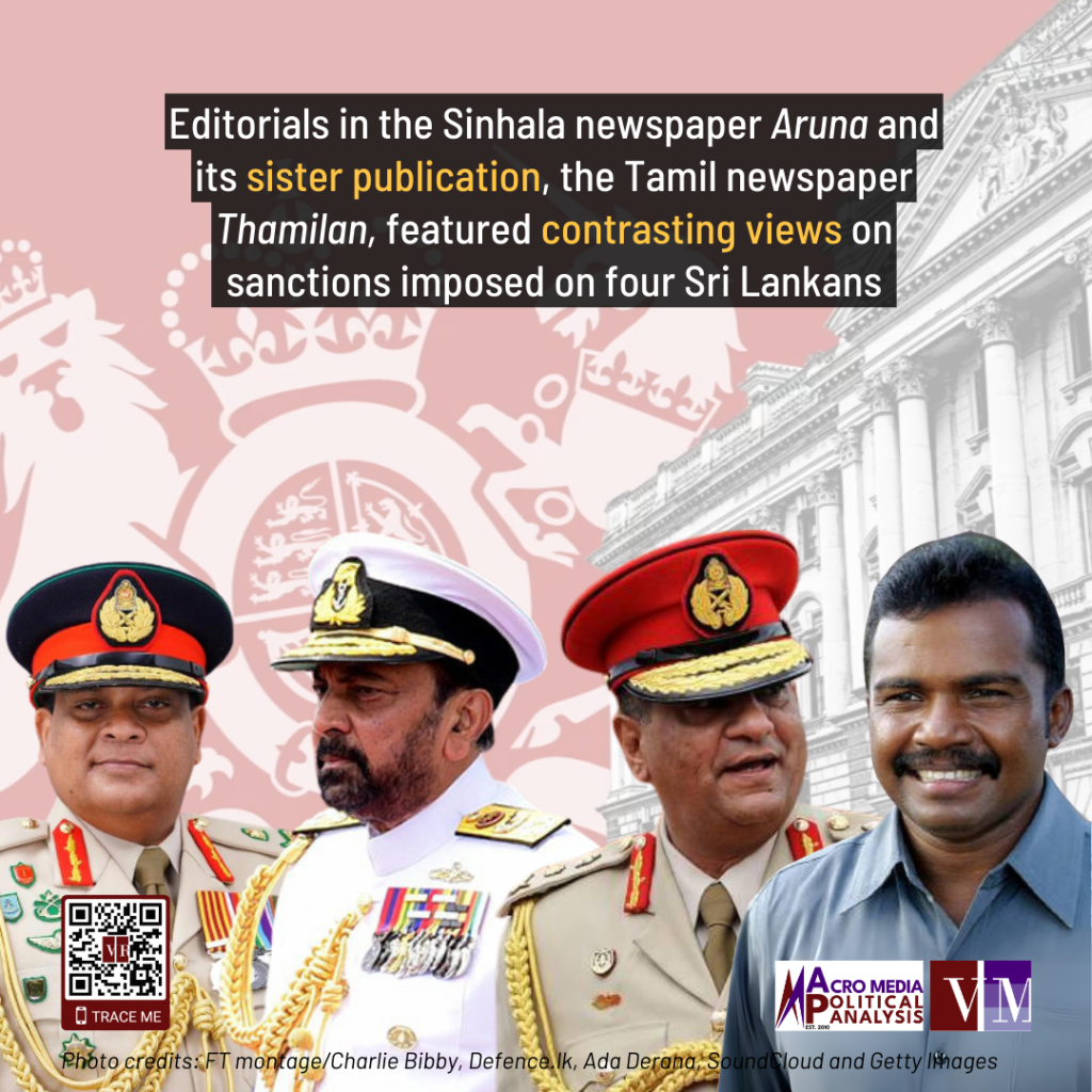 On March 24, the UK government sanctioned four Sri Lankans for human rights violations reportedly committed during Sri Lanka’s armed conflict. Editorials in the Sinhala newspaper Aruna and its sister publication, the Tamil newspaper Thamilan, featured contrasting views on sanctions imposed on four Sri Lankans.