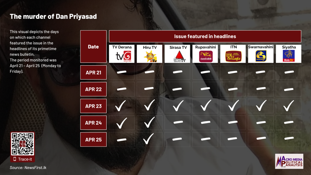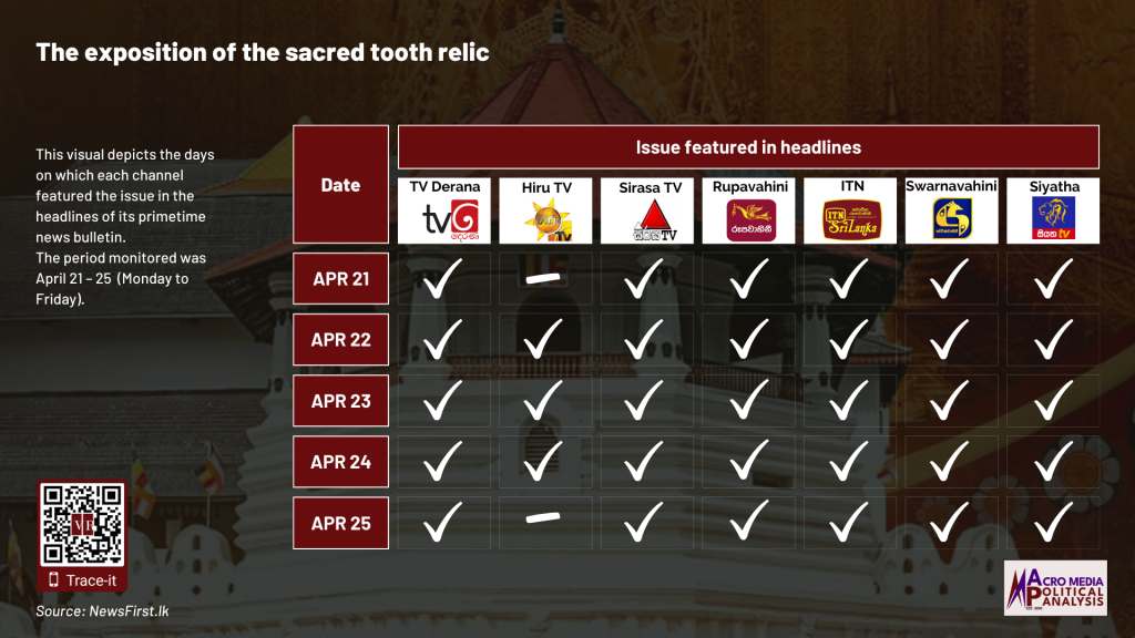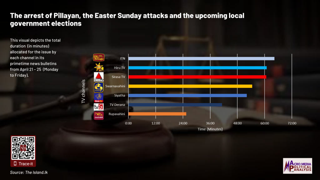 The data on television coverage is based on the monitoring of the primetime news telecasts of selected Sinhala language TV channels uploaded to YouTube.