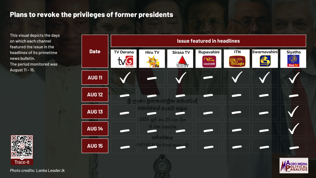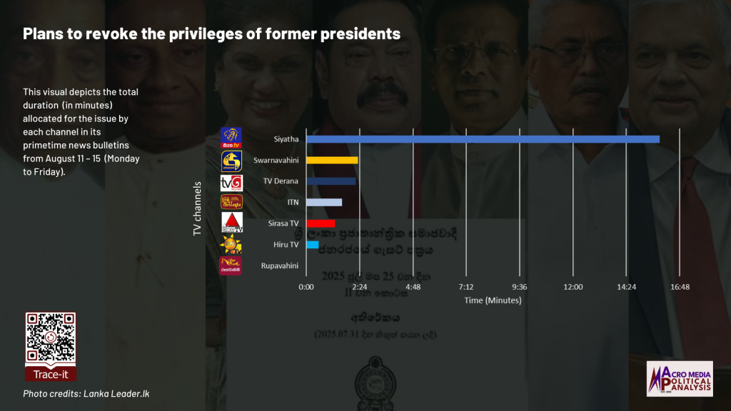 The data on television coverage is based on the monitoring of the primetime news telecasts of selected Sinhala TV channels uploaded to YouTube.