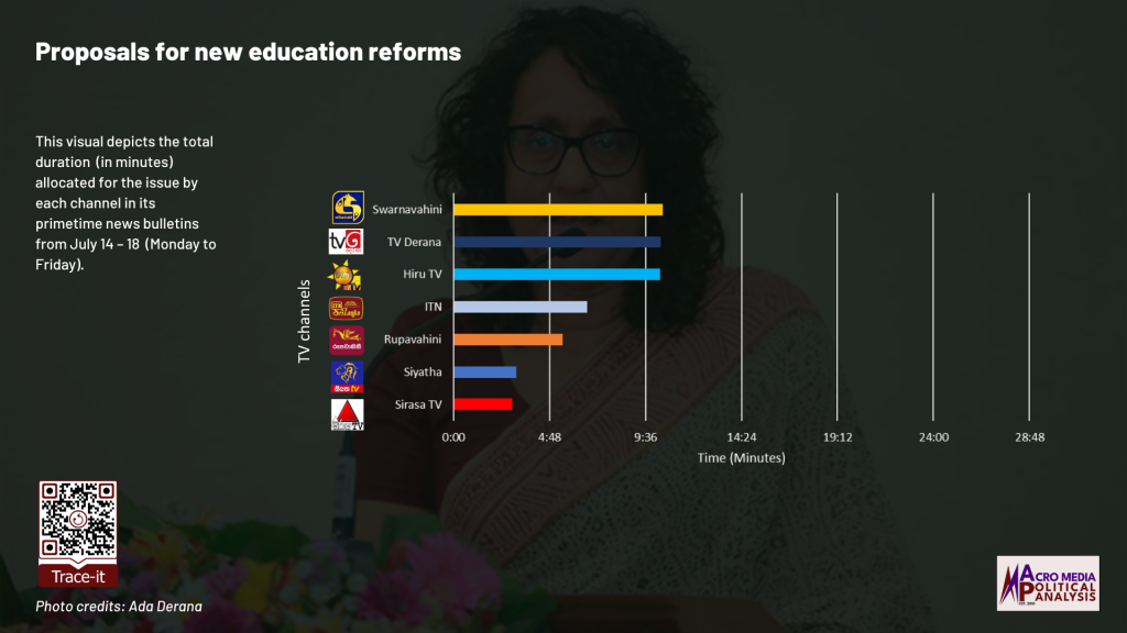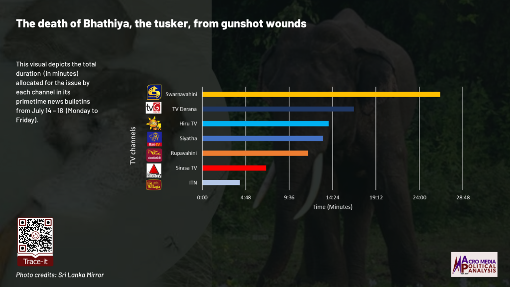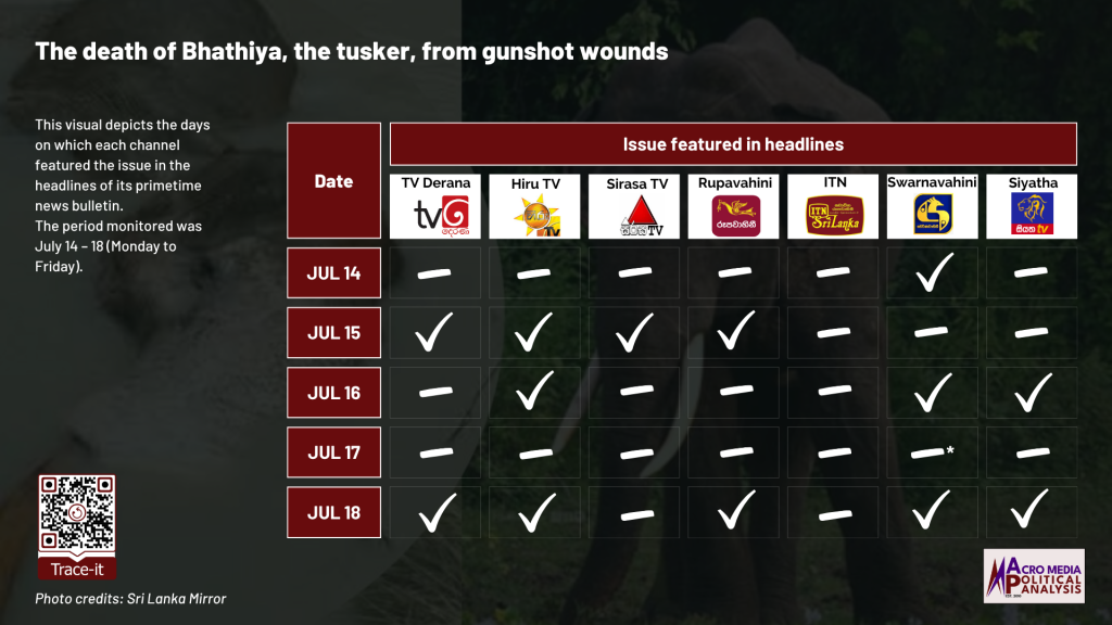 The data on television coverage is based on the monitoring of the primetime news telecasts of selected Sinhala language TV channels uploaded to YouTube. The headlines of the Swarnavahini news telecast on July 17 were not available on YouTube.