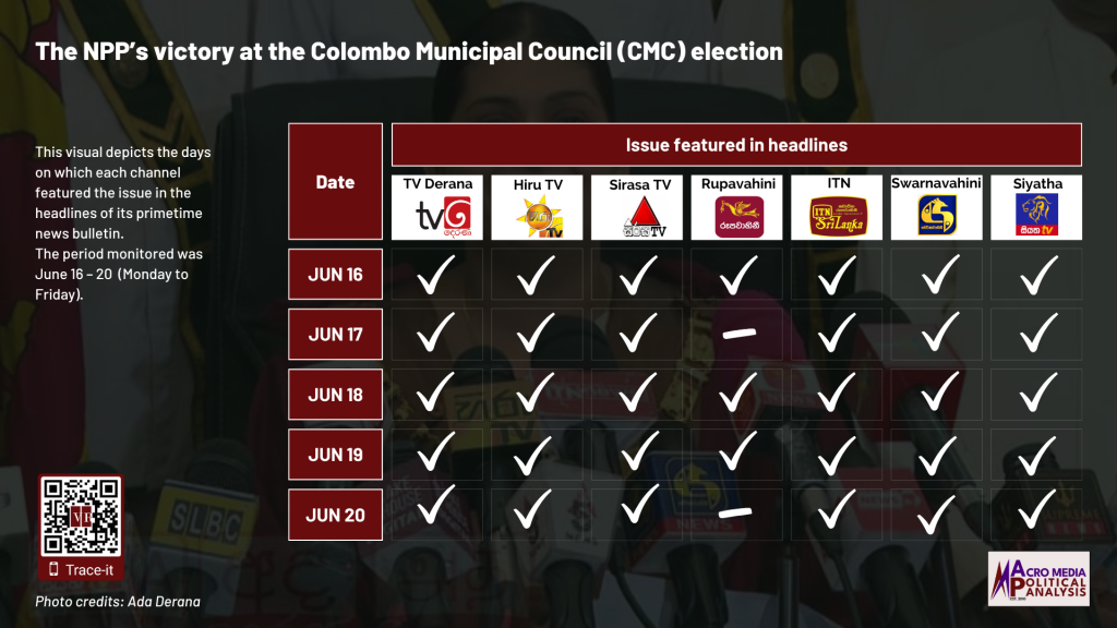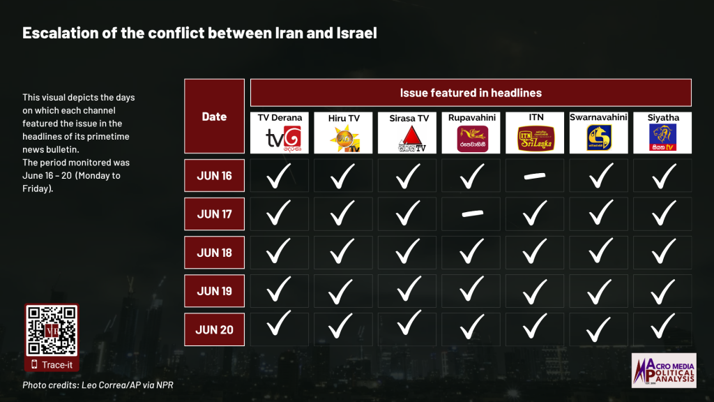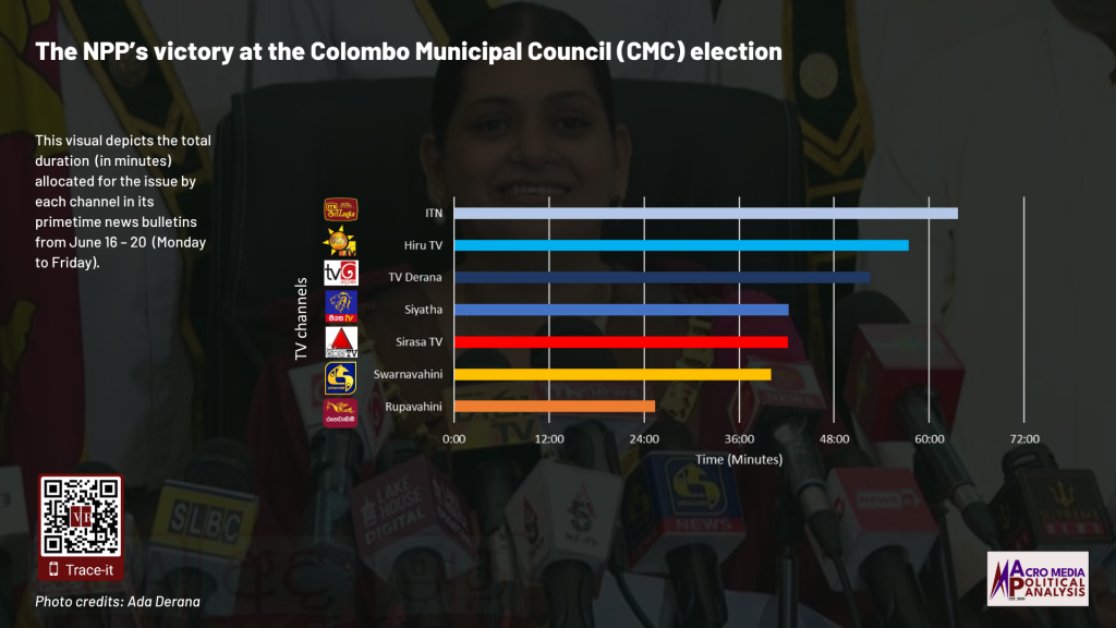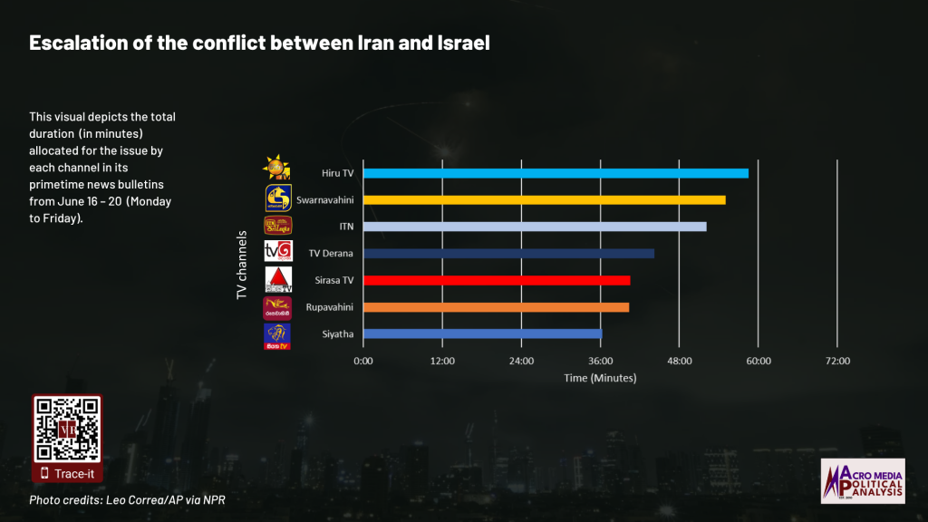The data on television coverage is based on the monitoring of the primetime news telecasts of selected Sinhala language TV channels uploaded to YouTube.