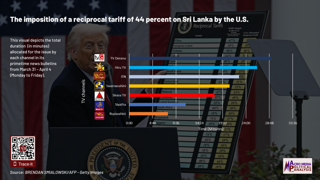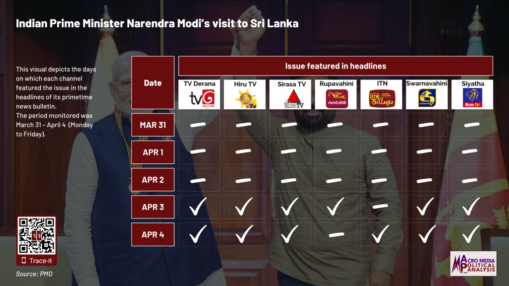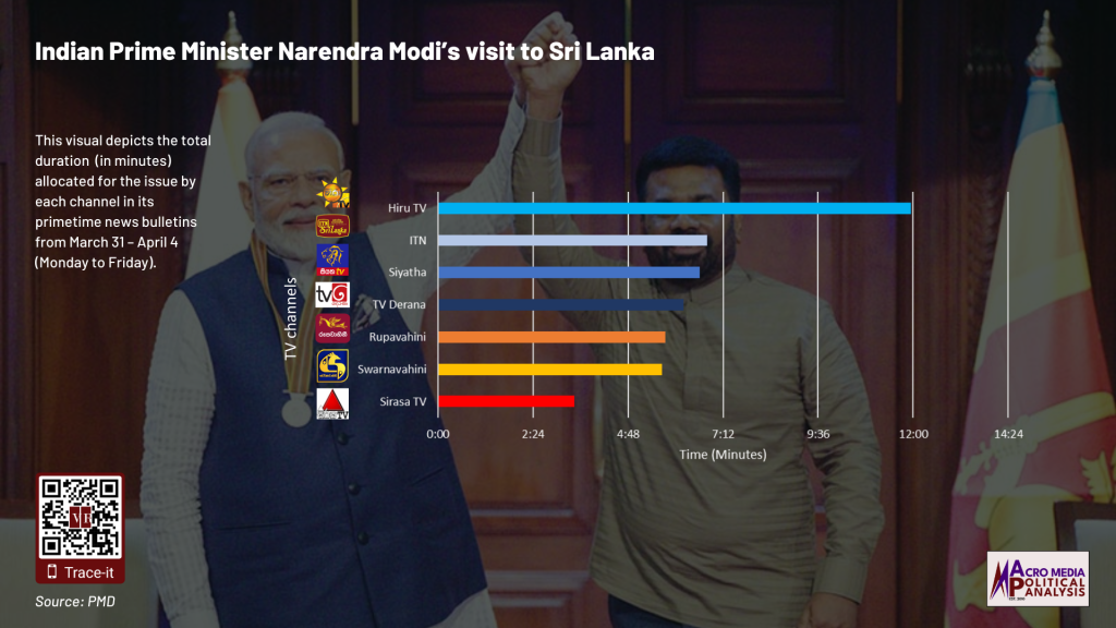 The data on television coverage is based on the monitoring of the primetime news telecasts of selected Sinhala language TV channels uploaded to YouTube.