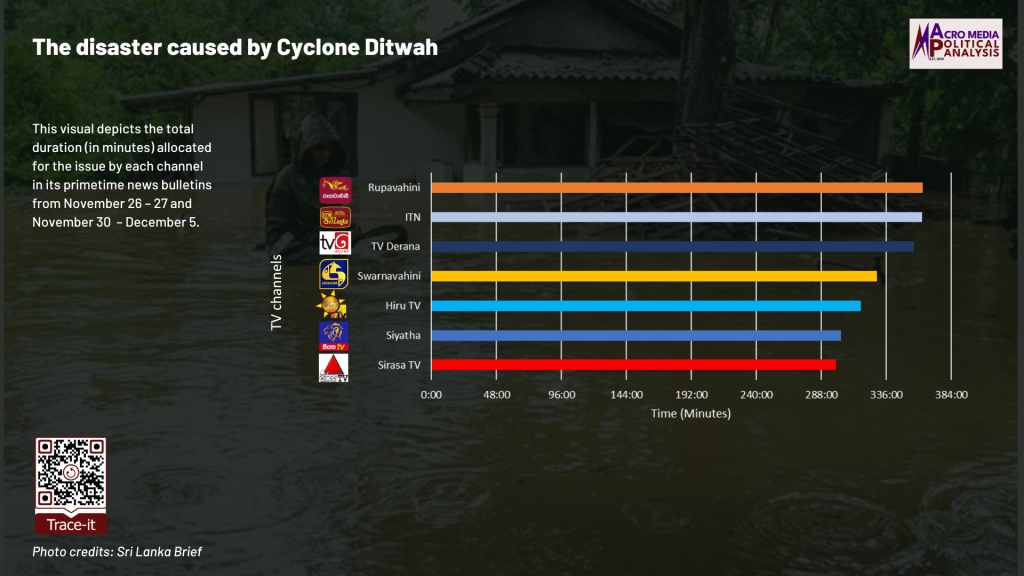 The data on television coverage is based on the monitoring of the primetime news telecasts of selected Sinhala TV channels uploaded to YouTube. On November 28 and 29, most channels did not follow the usual pattern of primetime news telecasts, and instead, covered the disaster situation extensively through continuous news updates. Hence, these two days have been excluded from the monitoring period.