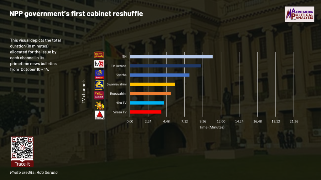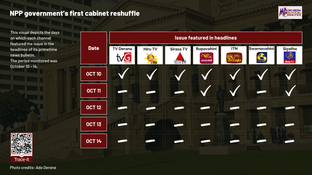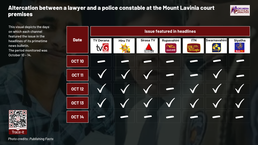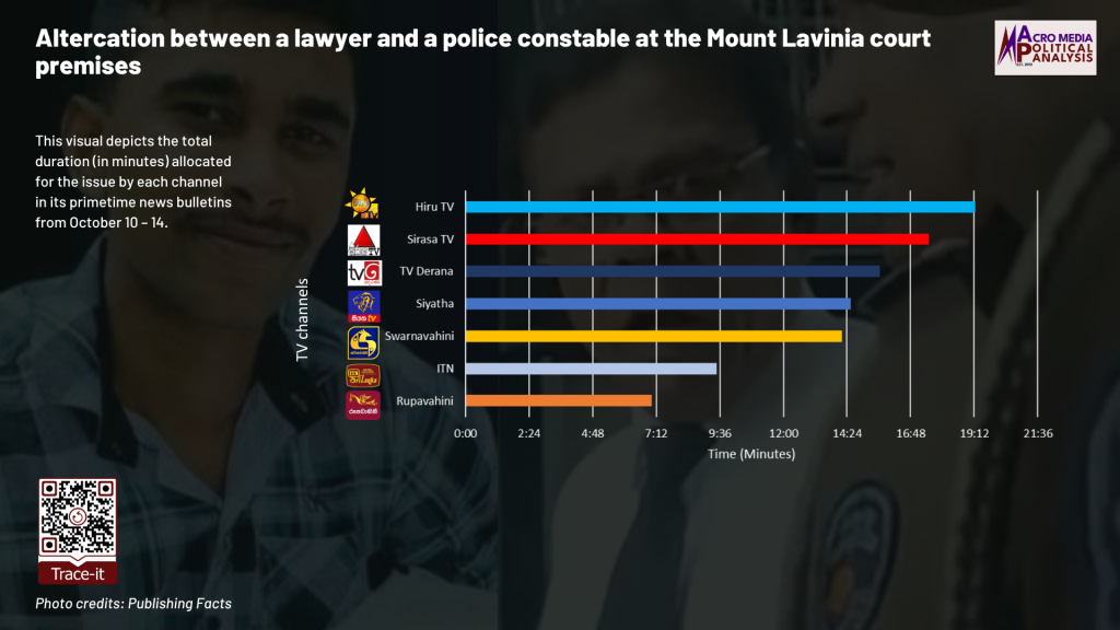 The data on television coverage is based on the monitoring of the primetime news telecasts of selected Sinhala TV channels uploaded to YouTube. The issues were monitored from October 10 – 14 to cover the period during which the events occurred.