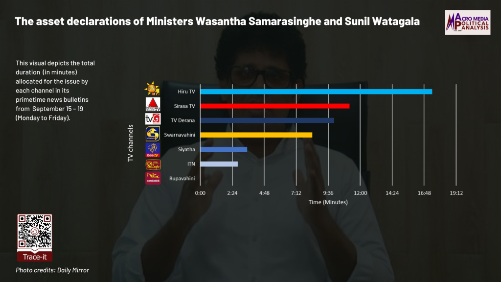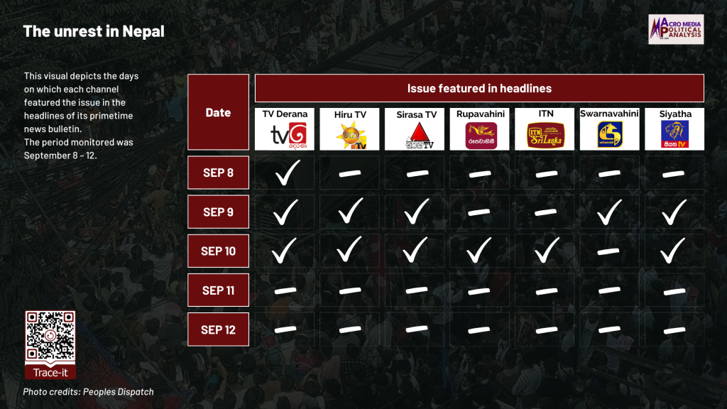 The data on television coverage is based on the monitoring of the primetime news telecasts of selected Sinhala TV channels uploaded to YouTube. The issue of unrest in Nepal was monitored from September 8 to 12, covering the time period during which the protests occurred.
