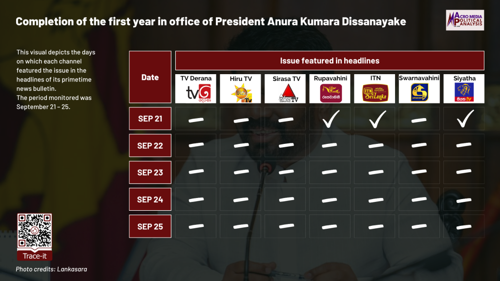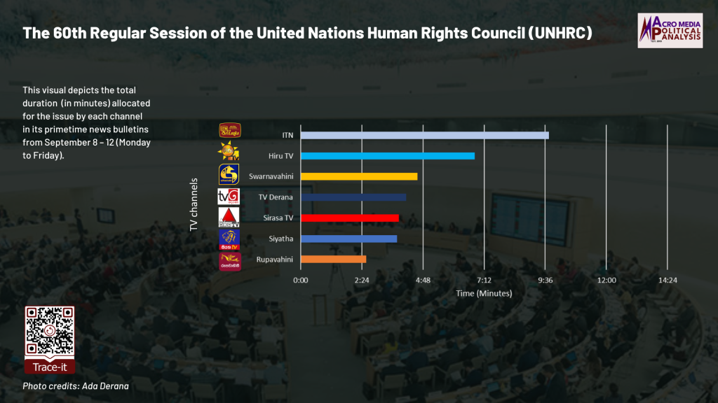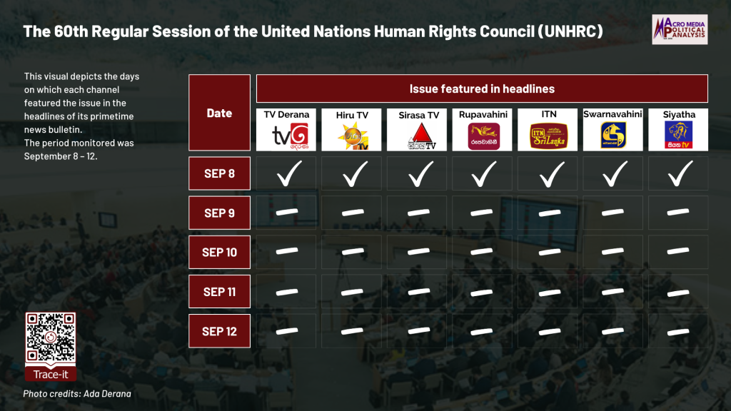 The data on television coverage is based on the monitoring of the primetime news telecasts of selected Sinhala TV channels uploaded to YouTube. The issue of the 60th Regular Session of the UNHRC was monitored from September 8 to 12, covering the time period during which the session commenced.