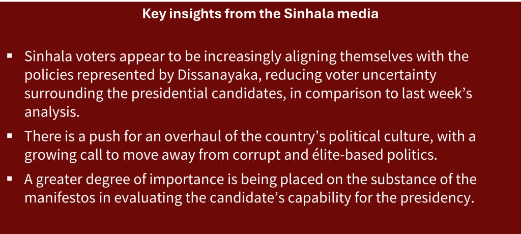 An evaluation of the Sinhala media outputs – including press, TV coverage and social media – on the 2024 PE reveals three narratives gaining momentum and shaping the electoral choices of Sinhala voters.[1]