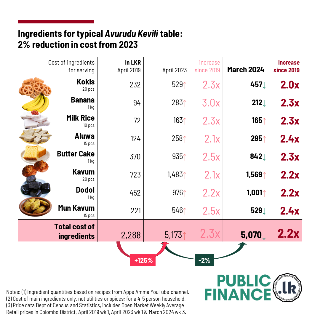 The cost of a traditional kevili table for the Sinhala and Tamil New Year went down in 2024 compared to 2023, but remained more than twice what it cost in 2019. For more information on the cost of a kevili table in 2024, click here
