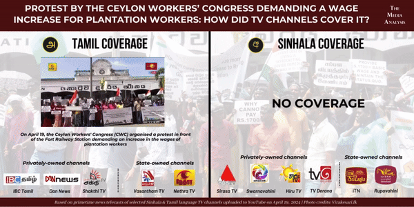 On April 19, the Ceylon Workers’ Congress (CWC) staged a protest in front of the Fort Railway Station demanding an increase in the wages of plantation workers. Privately-owned Tamil TV channels IBC Tamil, Dan News and Shakthi TV and state-owned Tamil TV channels Vasantham TV and Nethra TV afforded coverage to the protest in their primetime news telecasts. By contrast, privately-owned Sinhala TV channels Sirasa TV, Swarnavahini, Hiru TV and TV Derana and state-owned Sinhala TV channels ITN and Rupavahini did not afford any coverage to the protest. For more information, click here