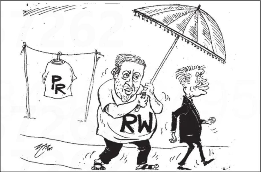 Context: Minister Prasanna Ranatunga escorting President Ranil Wickremesinghe under the muthu kuda (a special umbrella used mainly during Buddhist events in Sri Lanka), which signifies a sacred status.