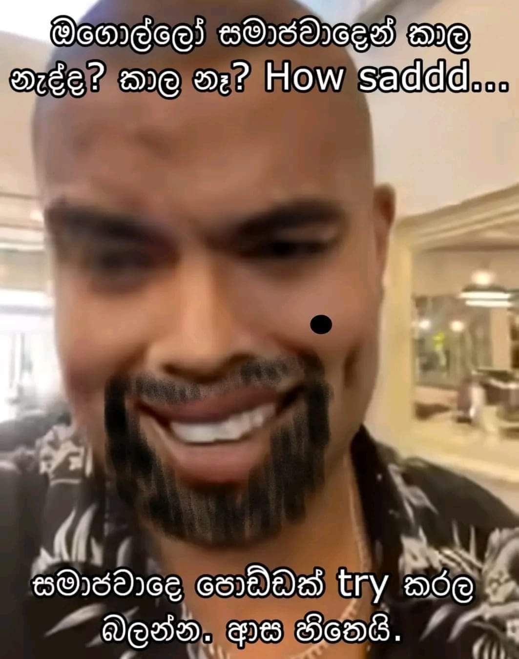 Context: This meme puns on TikTok videos published by content creator Mr. How Sad. Mr. How Sad creates Sinhala TikTok videos that promote products using the catchphrase lines, “Haven’t you tried it yet? How sad. Try it a little, you will like it.” This particular meme has modified Mr. How Sad’s face to resemble NPP Leader Anura Kumara Dissanayaka and puns on Mr. How Sad’s video on promoting Sri Lankan food.