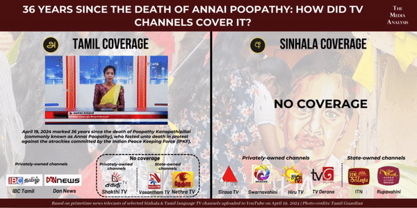 April 19, 2024 marked 36 years since the death of Poopathy Kanapathipillai (commonly known as Annai Poopathy), who fasted unto death to protest against the atrocities committed by the Indian Peace Keeping Force (IPKF). Only privately-owned Tamil channels IBC Tamil and Dan News made any reference to the incident.