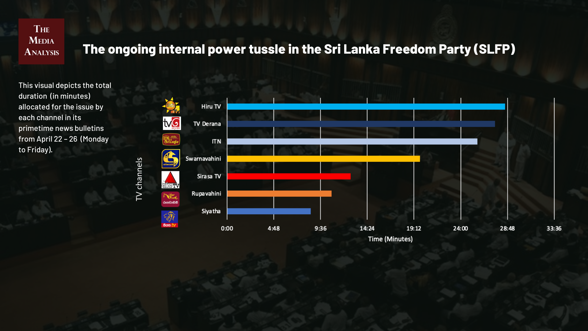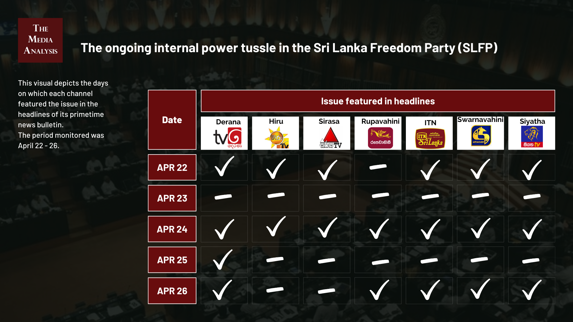 The data on television coverage is based on the monitoring of the primetime news telecasts of selected Sinhala language TV channels uploaded to YouTube.