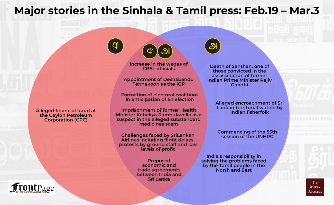 The last two weeks’ Sinhala and Tamil press converged in relation to six main stories. The six stories were on the: (i) increase in the wages of CBSL employees; (ii) appointment of Deshabandu Tennakoon as the IGP; (iii) formation of electoral coalitions in anticipation of an election; (iv) imprisonment of former Health Minister Keheliya Rambukwella as a suspect in the alleged substandard medicines scam; (v) challenges faced by SriLankan Airlines including flight delays, protests by ground staff and low levels of profit; and, the (vi) proposed economic and trade agreements between India and Sri Lanka. The Sinhala press exclusively featured one main story, and it was on the alleged financial fraud at the Ceylon Petroleum Corporation (CPC). The Tamil press exclusively featured four main stories. They were on the: (i) death of Santhan, one of those convicted in the assassination of former Indian Prime Minister Rajiv Gandhi; (ii) alleged encroachment of Sri Lankan territorial waters by Indian fisherfolk; (iii) commencing of the 55th session of the UNHRC; and (iv) India’s responsibility in solving the problems faced by the Tamil people in the North and East.