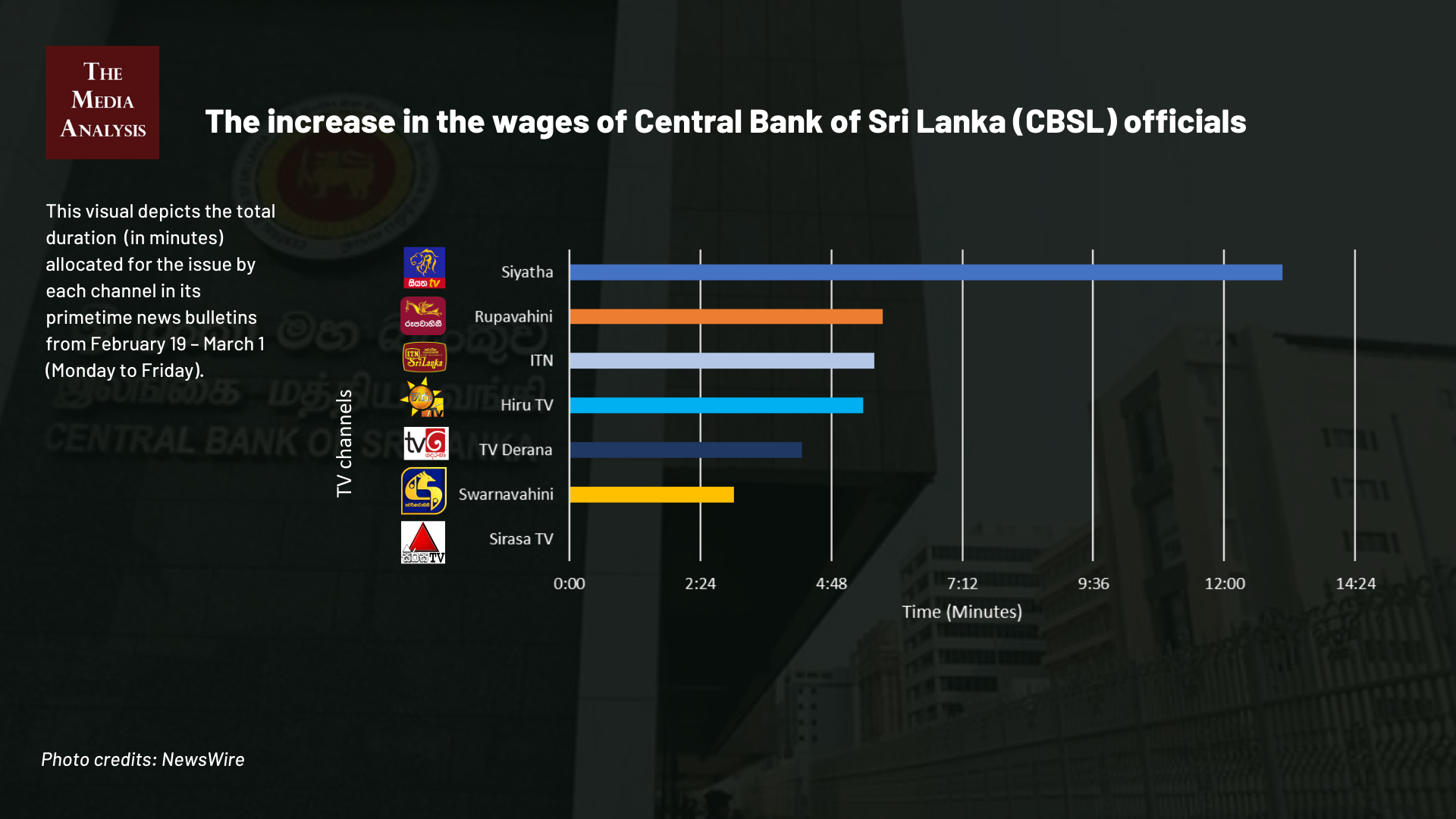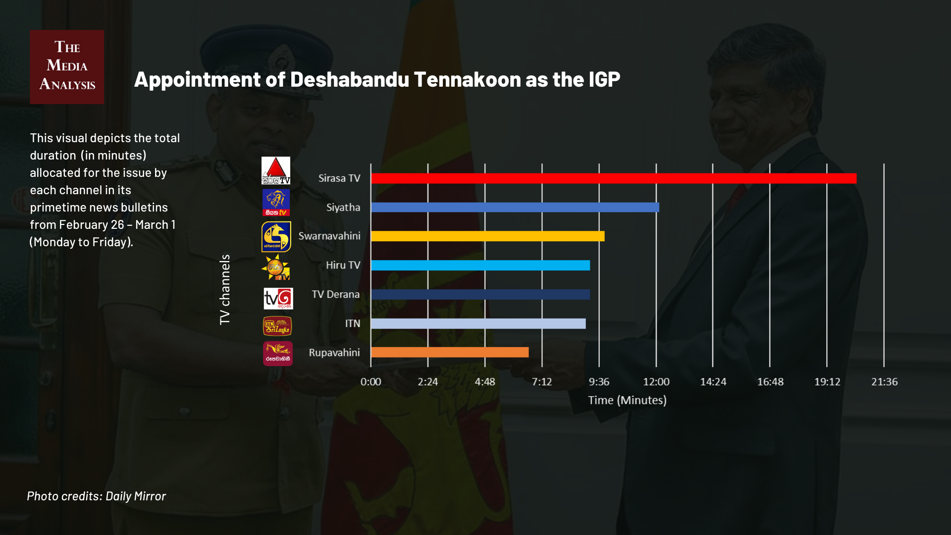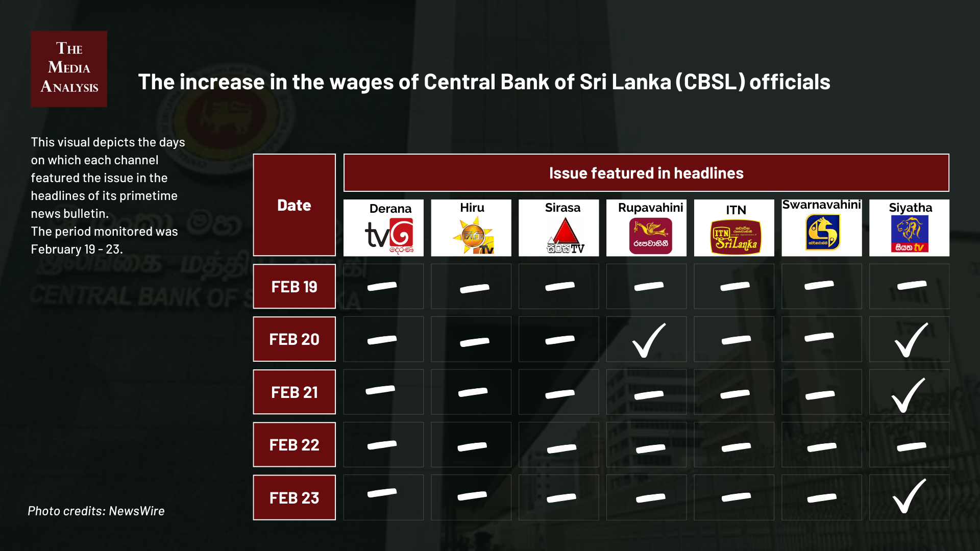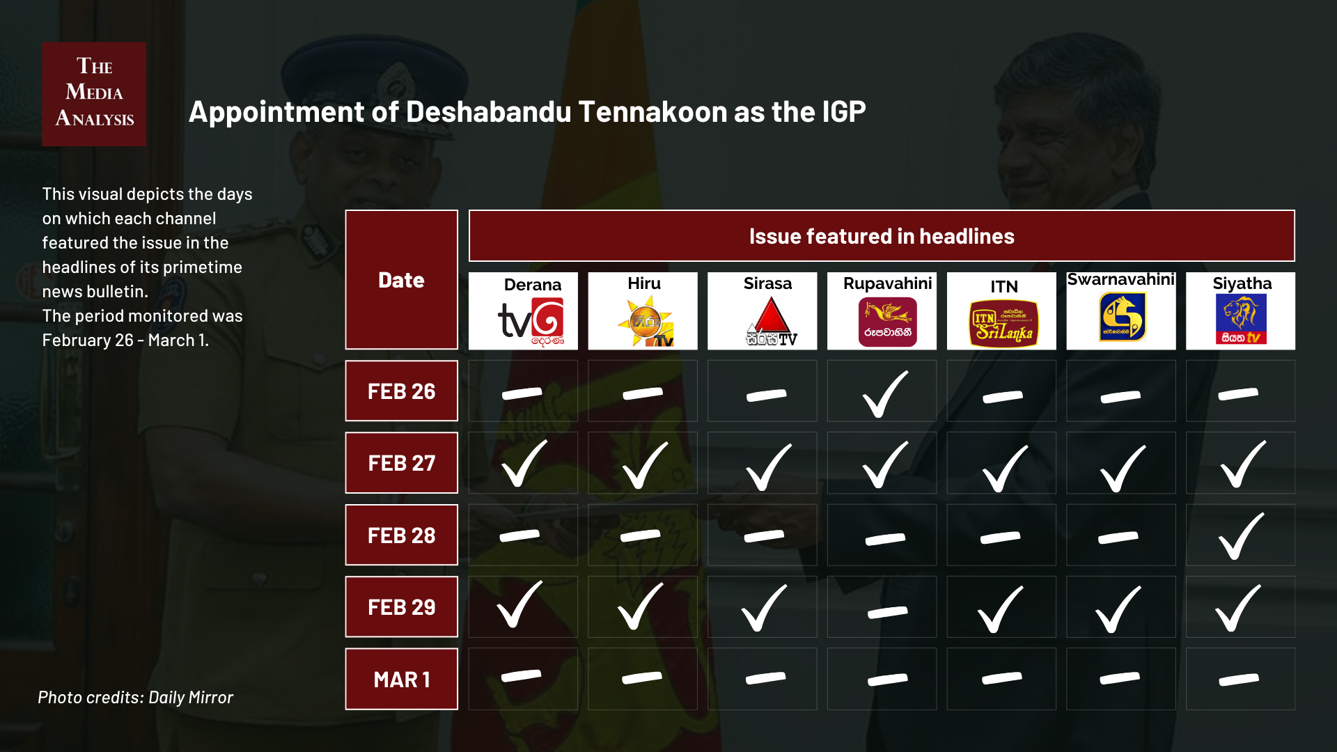 The data on television coverage is based on the monitoring of the primetime news telecasts of selected Sinhala language TV channels uploaded to YouTube. Monitoring for the issue on the appointment of Deshabandu Tennakoon as the IGP was carried out only from February 26 – March 1 as he was appointed to the post on February 26. No coverage was allotted on Sirasa TV for the issue of the increase in the wages of the Central Bank of Sri Lanka from February 19 – March 3.