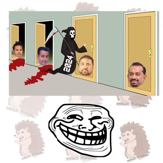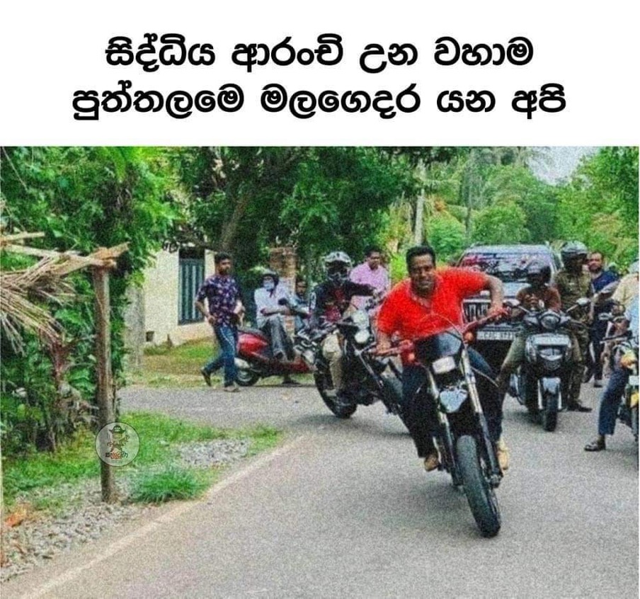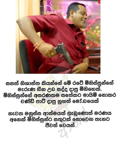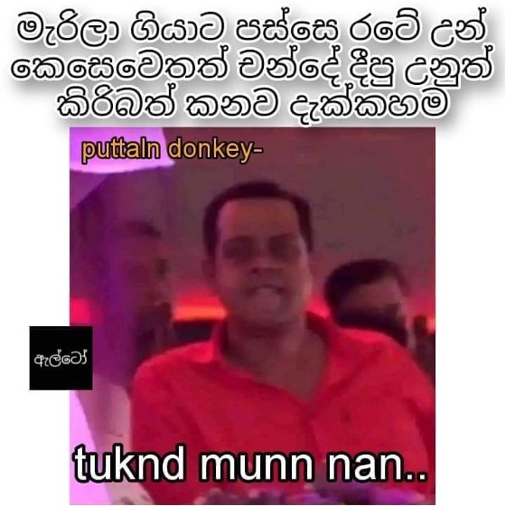 On the top of the meme – Puttalam donkey (the term “Puttalam booruwa (donkey)” is used in colloquial Sinhala to call someone a big fool. The term has a dual meaning here as Sanath Nishantha was an MP from the Puttalam District and was considered to be a fool by the people.)