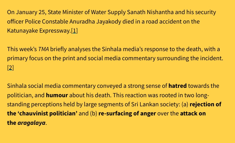 [2] In accordance with TMA’s methodology to monitor social media, the TMA team filtered the five posts with the highest interactions on Facebook in Sinhala for the name Sanath Nishantha and the phrase rest in peace using CrowdTangle, from January 22 to 27.