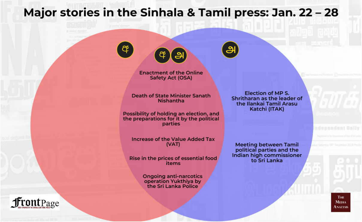 The past week’s Sinhala and Tamil press converged in relation to six main stories. The six stories were on the: (i) enactment of the Online Safety Act (OSA); (ii) death of State Minister Sanath Nishantha; (iii) possibility of holding an election, and the preparations for it by the political parties; (iv) increase of the Value Added Tax (VAT); (v) rise in the prices of essential food items.; (vi) ongoing anti-narcotics operation Yukthiya by the Sri Lanka Police. The Tamil press exclusively featured stories on the election of MP S. Shritharan as the leader of the Ilankai Tamil Arasu Katchi (ITAK) and the meeting between Tamil political parties and the Indian high commissioner to Sri Lanka. There were no stories featured exclusively in the Sinhala press.