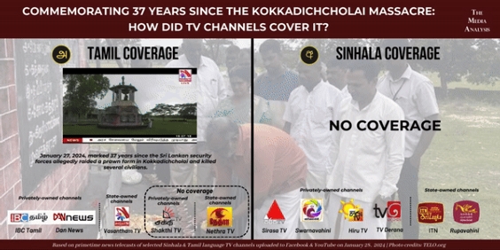 January 27, 2024 marked 37 years since the Sri Lankan security forces allegedly raided a prawn farm in Kokkadichcholai and killed several civilians. A commemorative event was held on that day. Privately-owned Tamil channels IBC Tamil and Dan News and state-owned Vasantham TV allotted coverage to the incident. However, none of the Sinhala TV channels nor state-owned Tamil channel Nethra TV and privately-owned Shakthi TV allotted any coverage to the incident.