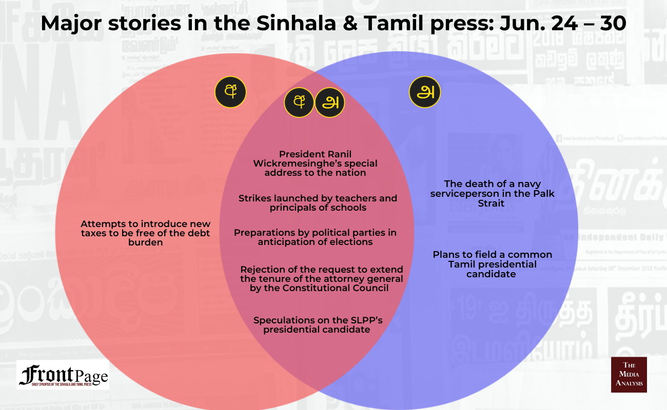Last week’s Sinhala and Tamil press converged in relation to five main stories. The five stories were on: (i) President Ranil Wickremesinghe’s special address to the nation; (ii) the strikes launched by teachers and principals of schools; (iii) preparations by political parties in anticipation of elections; (iv) the rejection of the request to extend the tenure of the attorney general by the Constitutional Council; (v) speculations on the SLPP’s presidential candidate. The Sinhala press exclusively featured the attempts to introduce new taxes to be free of the debt burden. The Tamil press exclusively featured two main stories, and they were on the: (i) death of a navy serviceperson in the Palk Strait and (ii) plans to field a common Tamil presidential candidate.