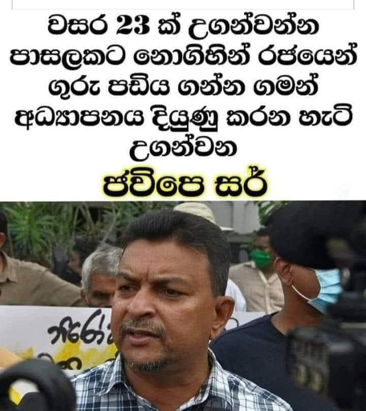 The JVP’s sir (teacher) who is teaching us how to improve education while receiving his teacher’s salary from the government, even though he has not set foot in a school for 23 years to teach (refers to General Secretary of the JVP-led Ceylon Teachers’ Service Union Mahinda Jayasinghe)