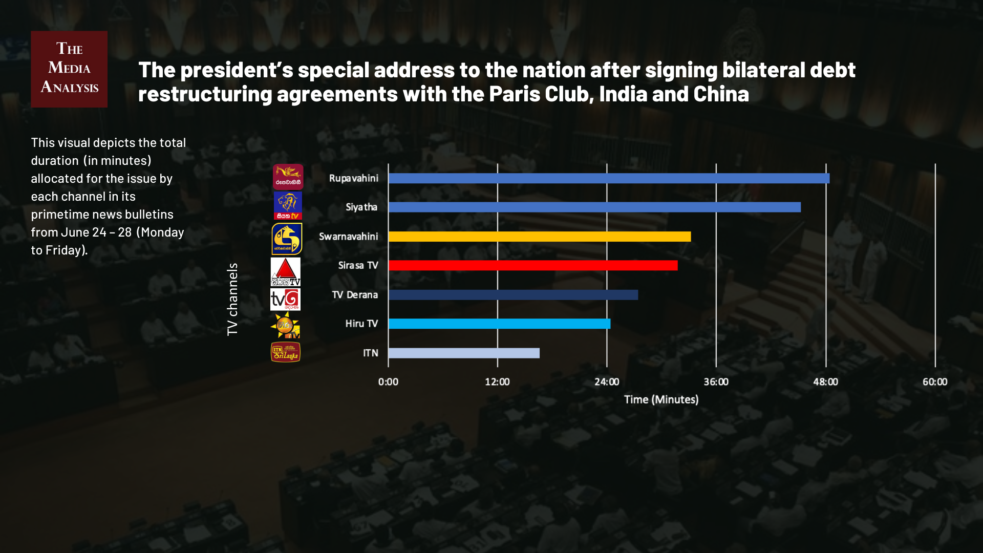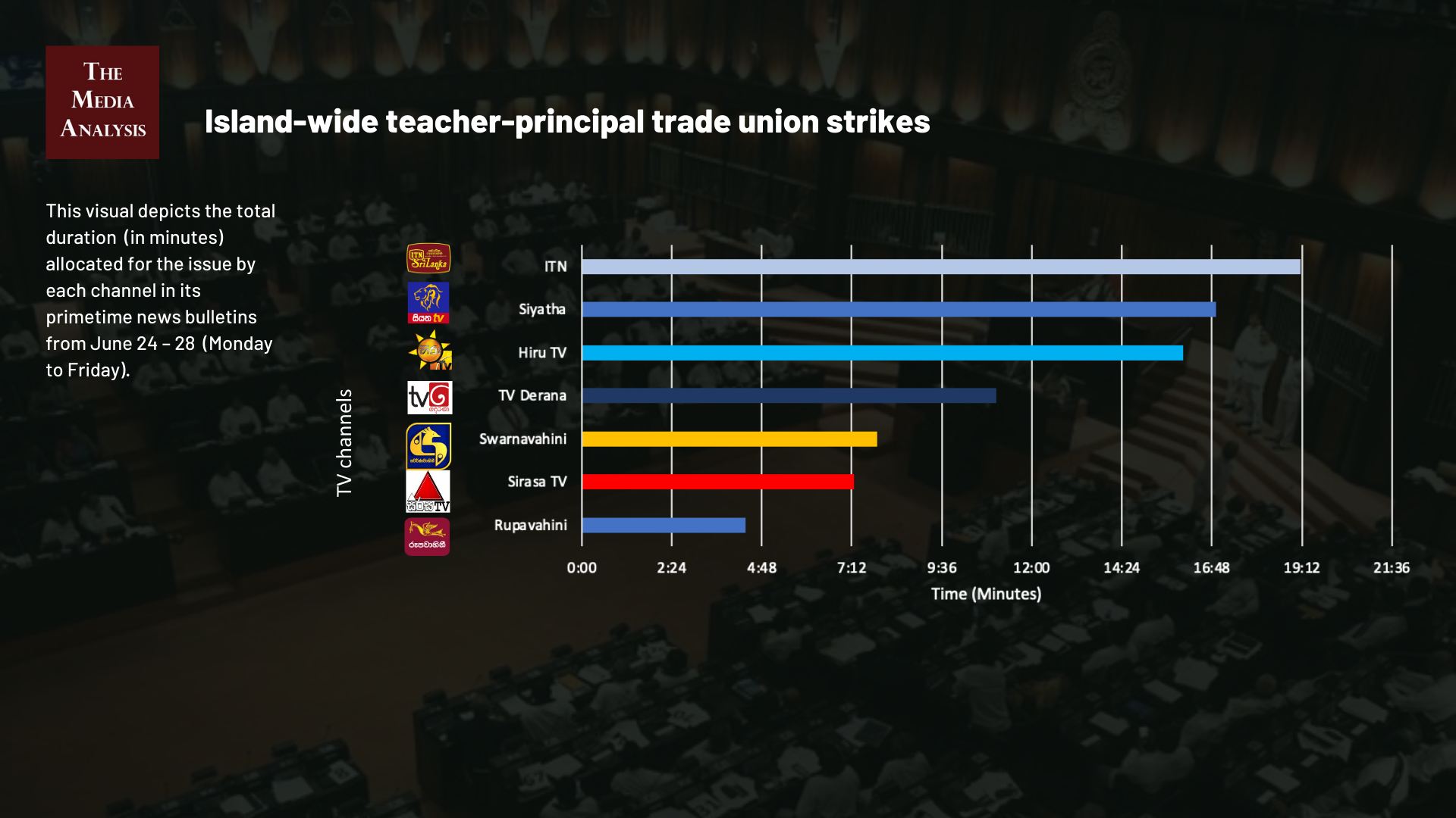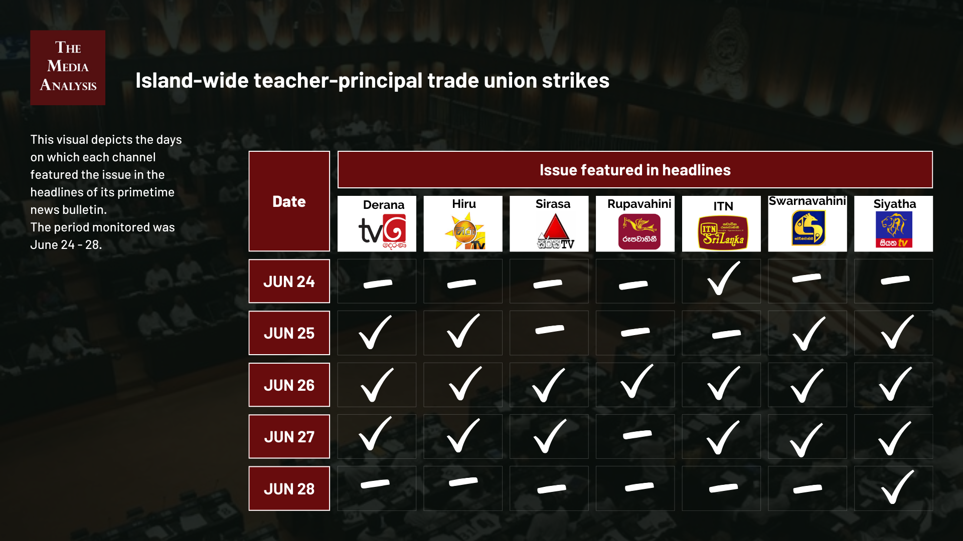 The data on television coverage is based on the monitoring of the primetime news telecasts of selected Sinhala language TV channels uploaded to YouTube.