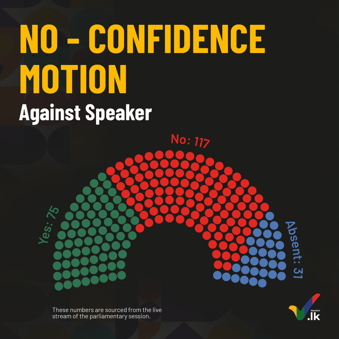 The no confidence motion brought against Speaker Mahinda Yapa Abeywardana was defeated on March 21. 75 MPs voted in favour of the motion, 117 voted against it and 31 MPs were absent at the time of the vote. For more information on the breakdown of the votes, click here