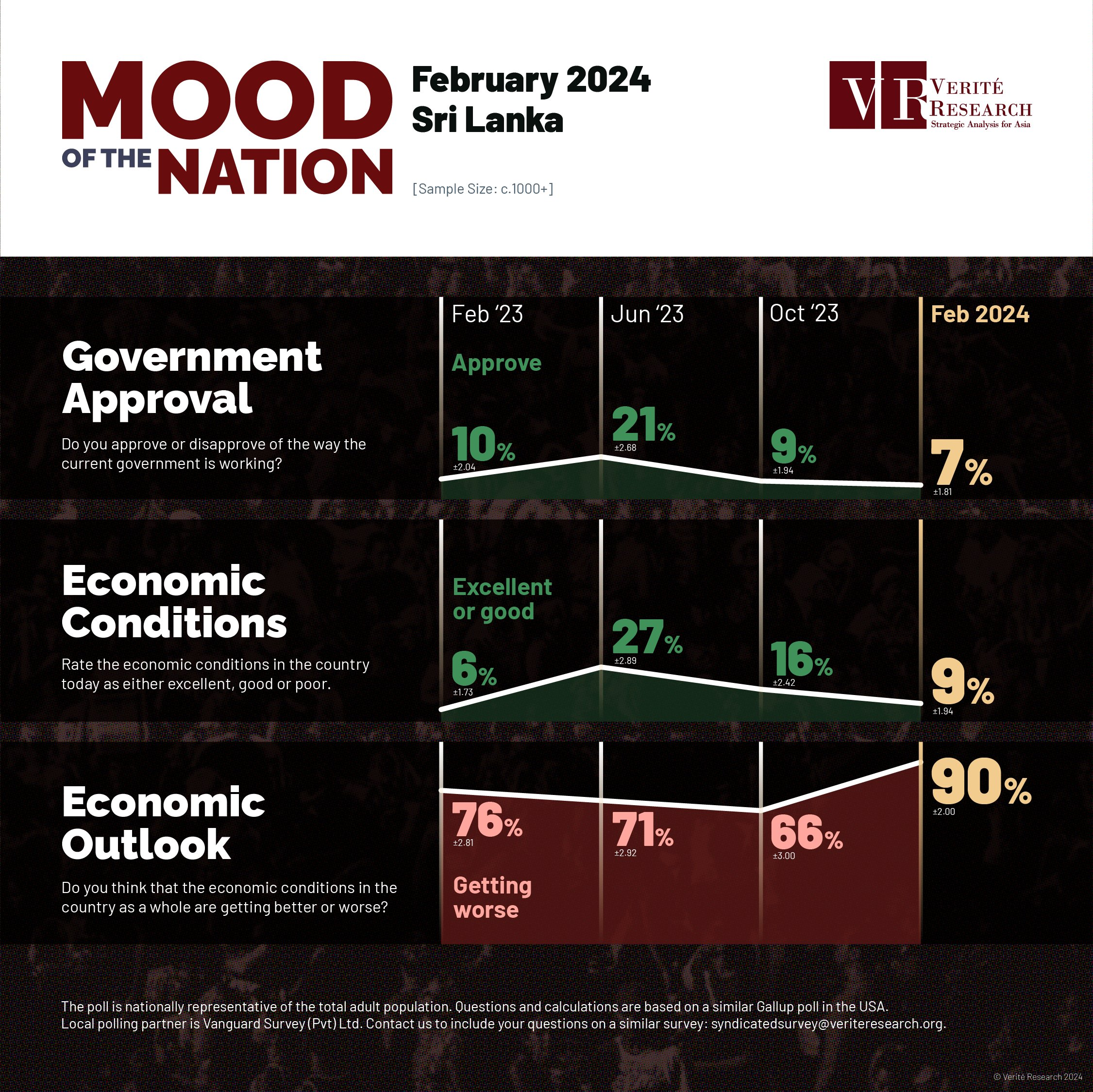 The approval rating of the government fell from nine percent in October 2023 to seven percent in February 2024 as found by the Mood of the Nation poll of Verité Research. Only nine percent rated the current economic conditions in Sri Lanka as either excellent or good and 90 percent thought economic conditions were getting worse. For more information on the poll results, click here