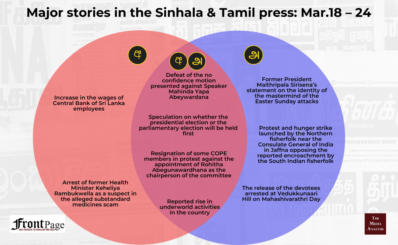 Last week’s Sinhala and Tamil press converged in relation to four main stories. The four stories were on the: (i) defeat of the no confidence motion presented against Speaker Mahinda Yapa Abeywardana; (ii) speculation on whether the presidential election or the parliamentary election will be held first; (iii) resignation of some COPE members in protest against the appointment of Rohitha Abegunawardhana as the chairperson of the committee; (iv) reported rise in underworld activities in the country. Two main stories were featured exclusively in the Sinhala press, and they were on: (i) the increase in the wages of Central Bank of Sri Lanka employees and (ii) the arrest of former Health Minister Keheliya Rambukwella as a suspect in the alleged substandard medicines scam. The Tamil press exclusively featured three main stories. They were on: (i) former President Maithripala Sirisena’s statement on the identity of the mastermind of the Easter Sunday attacks, (ii) the protest and hunger strike launched by the Northern fisherfolk near the Consulate General of India in Jaffna opposing the reported encroachment by the South Indian fisherfolk and (iii) the release of the devotees arrested at Vedukkunaari Hill on Mahashivarathri Day.