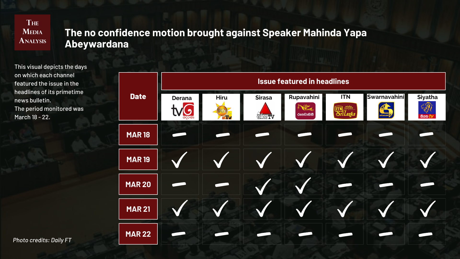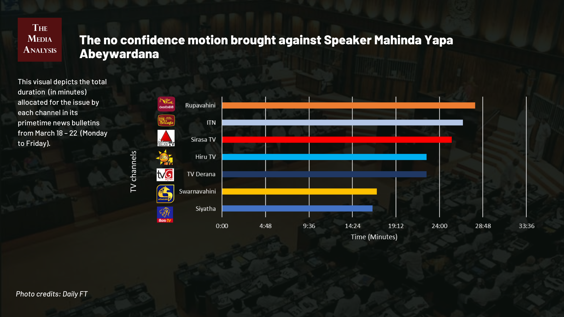 The data on television coverage is based on the monitoring of the primetime news telecasts of selected Sinhala language TV channels uploaded to YouTube.